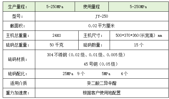 型號:YUNYI7250 量程:5-250MPa 精度:0.005% 最小砝碼(含底盤)5MPa